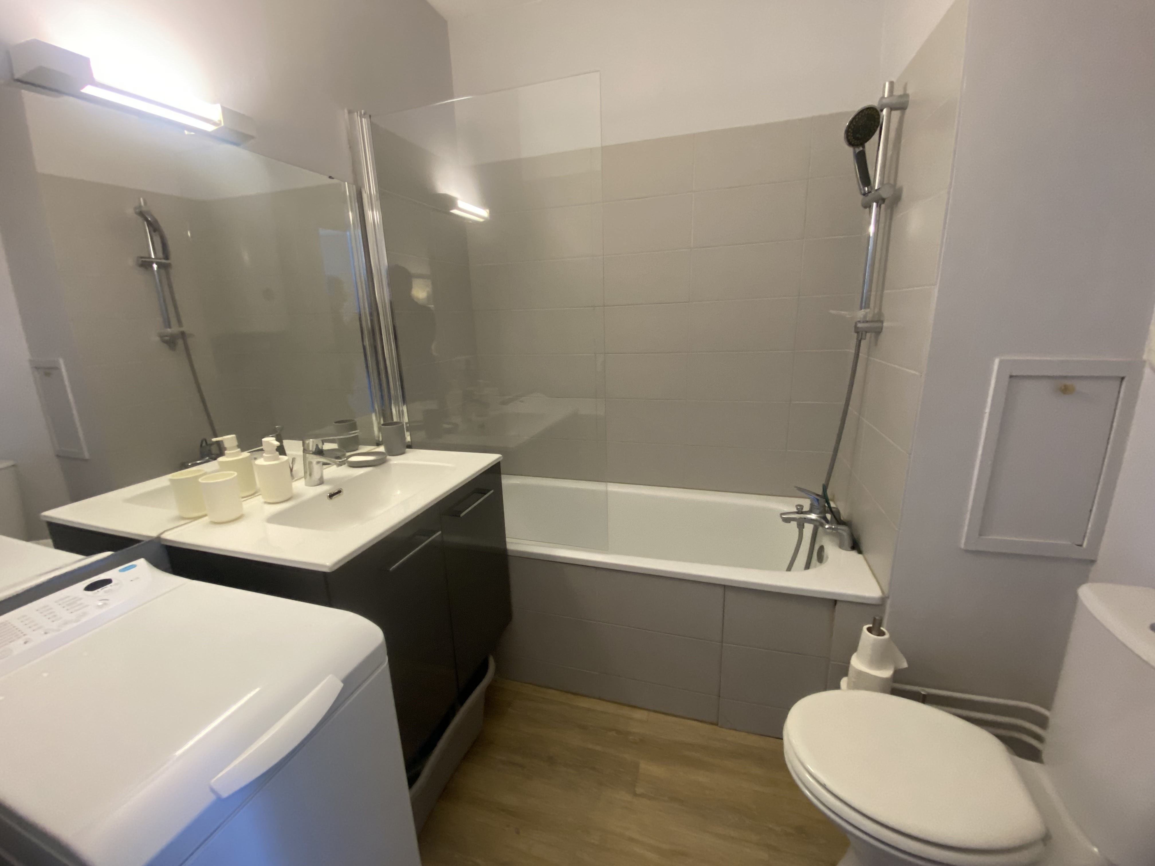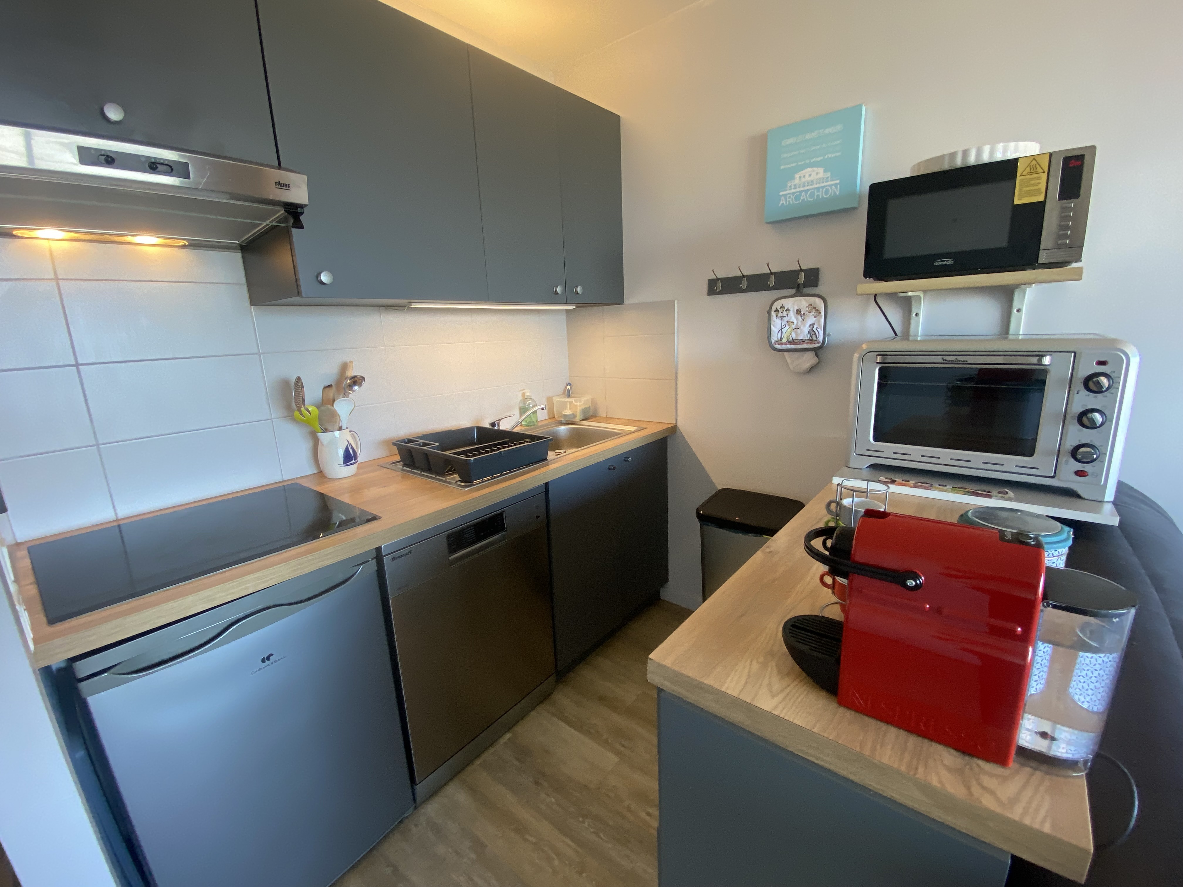 -cuisine entièrement équipée : plaque à induction, four, micro-ondes, réfrigérateur avec freezer, lave-vaisselle, évier, bouilloire, grille-pain et vaisselle complète. Vous trouverez aussi un lave-linge, un aspirateur.