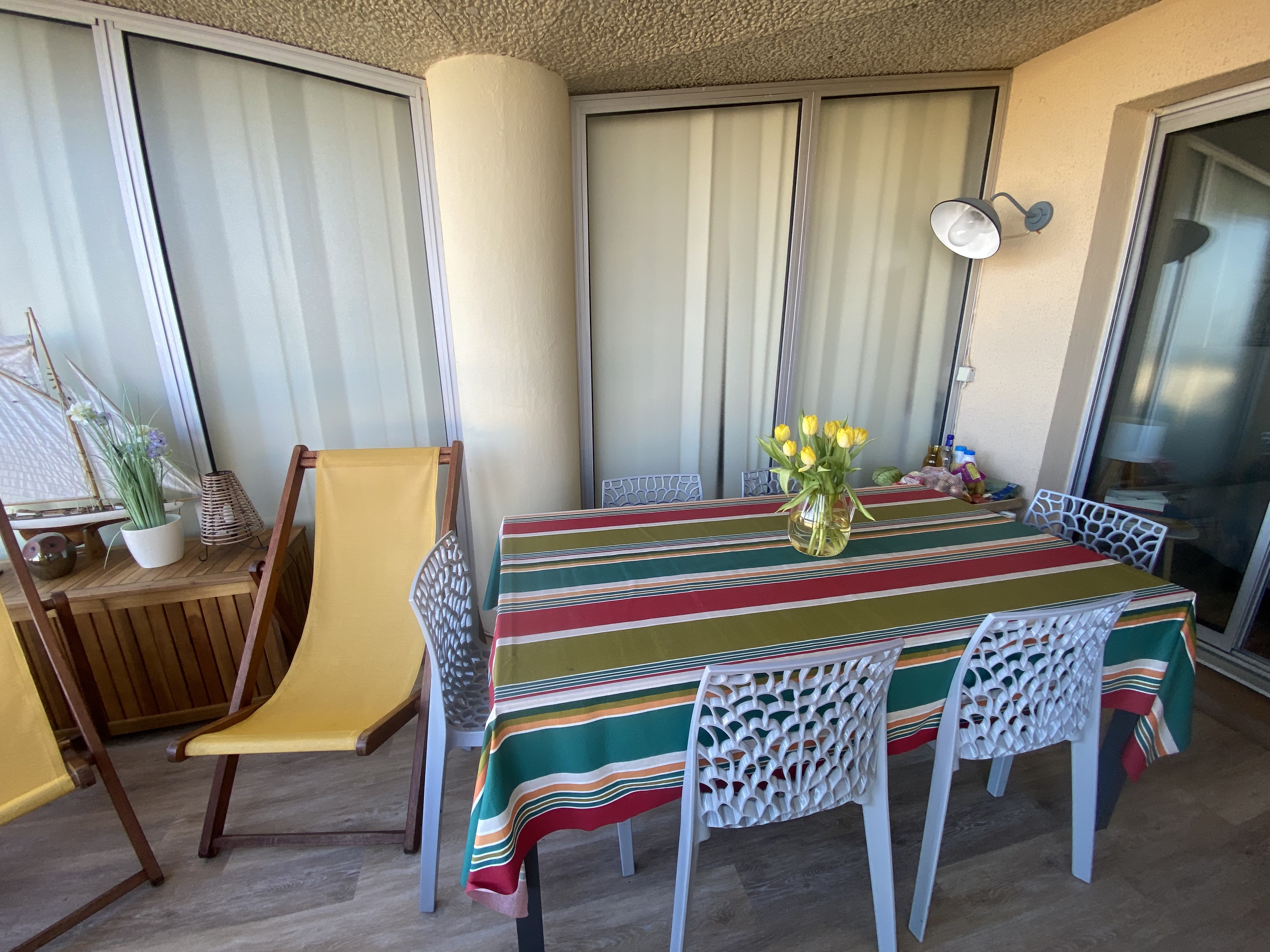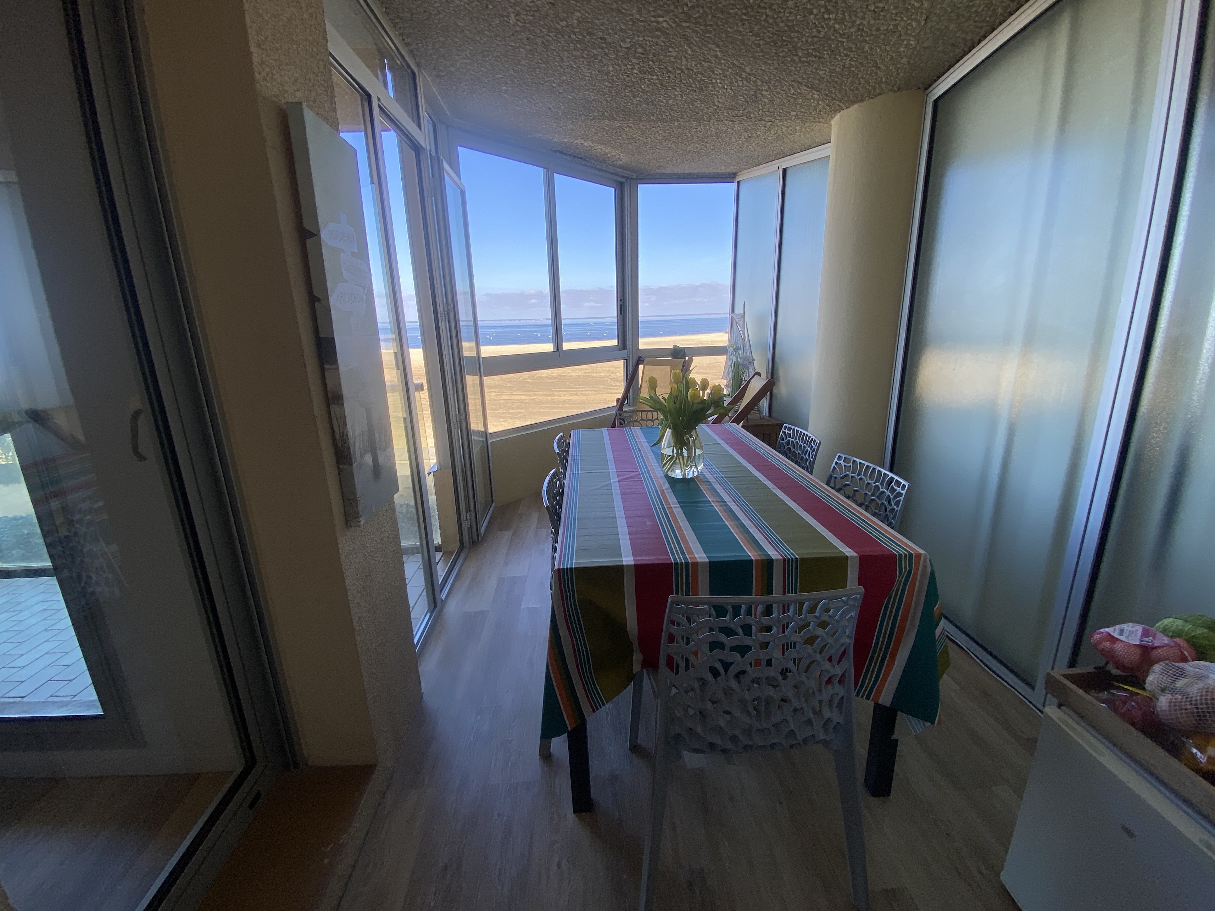 -séjour double avec canapé, coin repas dans la véranda le tout donnant sur terrasse avec mobilier et superbe vue mer.