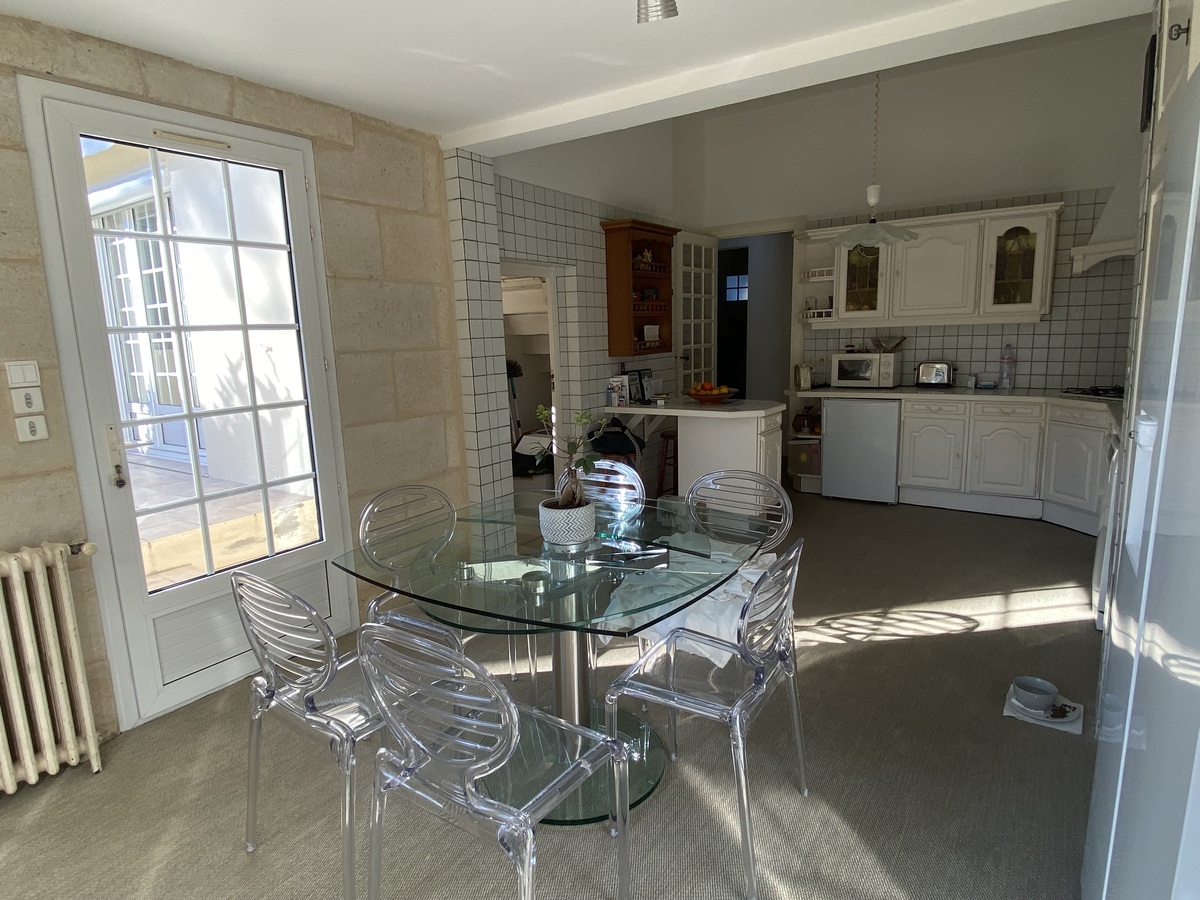 séjour double, grande cuisine, chambre.
