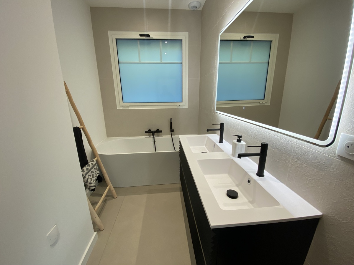 RDC : séjour double cathédrale de 52m2 avec cuisine ouverte équipée, 2 chambres, salle de bain, salle d'eau, wc indépendant.