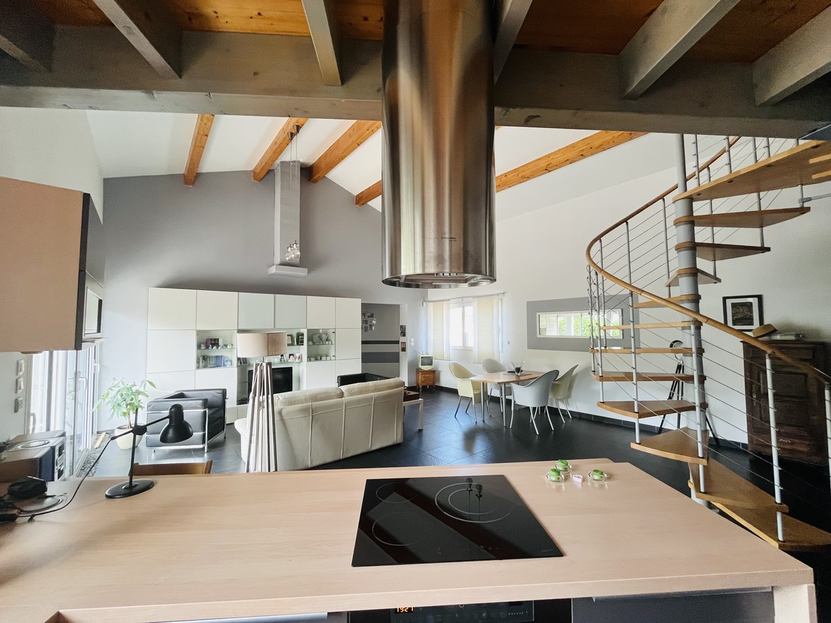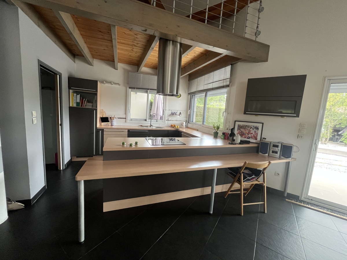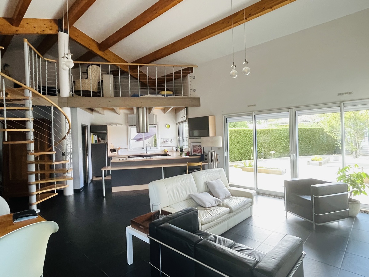 Maison moderne avec charpente apparente de plain pied.